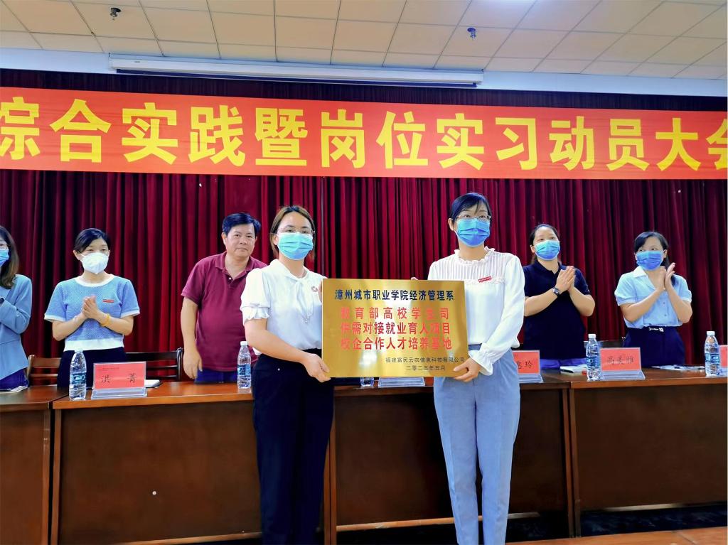系主任张少华从综合实践与岗位实习的目的与意义、实习单位的遴选与管理、员工实习管理规定等方面为即将踏上岗位实习的同学作了细致说明。他强调综合实践与岗位实习是高职教育中重要的实践性教学环节,是全面提升员工职业能力、职业素养的重要载体,同学们要积极主动参与实践实习,认真遵循实习管理规定,时刻注意岗位实习安全,高质量完成岗位实习任务。同时,张少华主任对福建富民云咖信息科技有限公司一行的到来致以欢迎,充分肯定了该公司在推动校企合作方面所做的努力。在与会人员的共同见证下,校企双方互授牌匾。