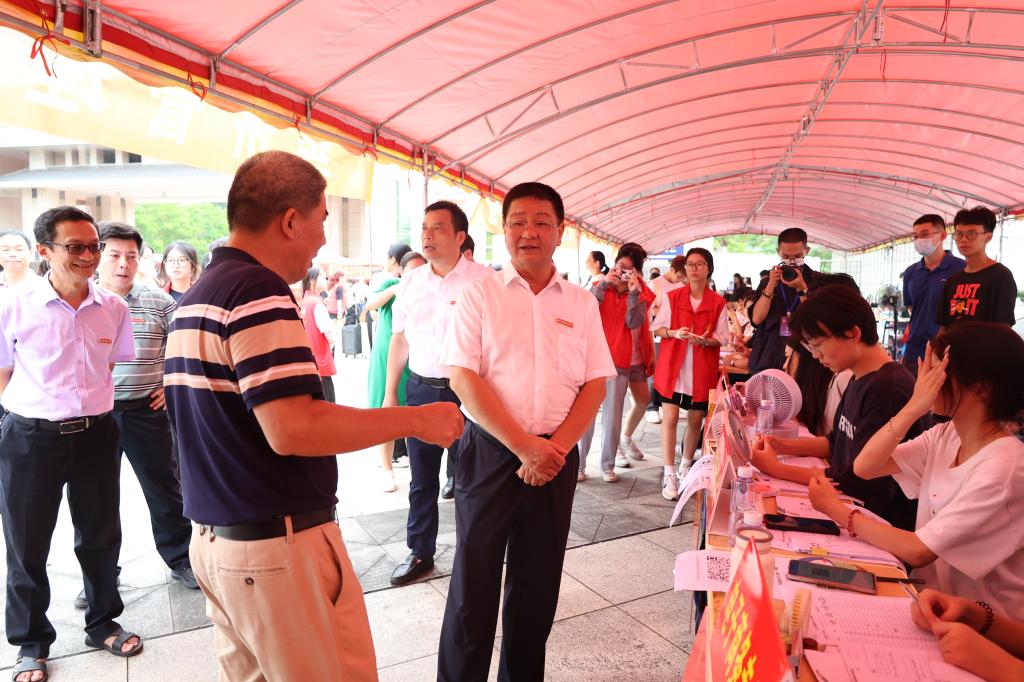公司领导深入迎新报到点,了解新生报到情况,亲切慰问工作人员和志愿者,并表达对新生们的美好祝福。