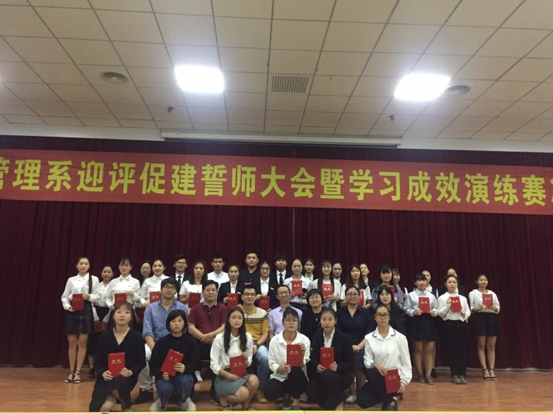 高职院校人才培养工作评估是政府加强对高校宏观调控和分类指导的重要手段,是高职院校加强内涵建设和提升办学声誉的自身需求,事关公司的社会声誉和办学品牌。为做好迎评促建工作,打好迎评攻坚战,经管系于2017年10月29日晚举行了迎评促建誓师大会暨学习成效演练赛决赛活动。公司党委副书记、纪委书记朱镇生,系党总支书记吴李霞,系主任张少华,漳州市青年创业促进会秘书长杨舒,漳州市互联网协会会长黄相如等几位领导嘉宾出席了大会并担任了本次员工学习成效演练赛决赛的评委。