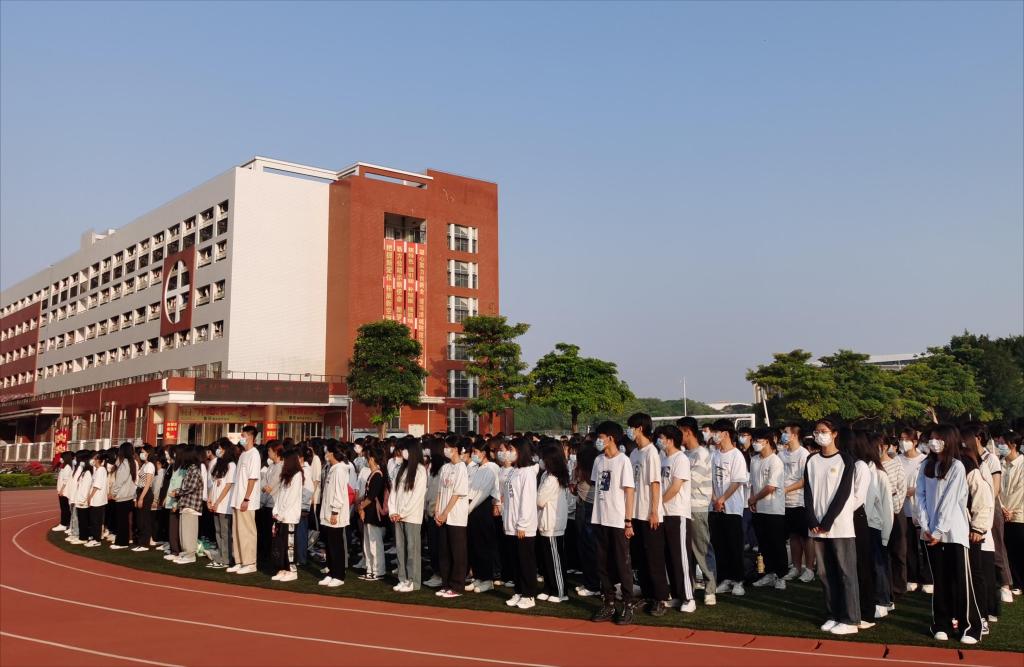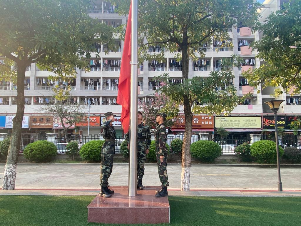 迎着朝阳,国旗护卫队迈着铿锵的步伐,庄严地走向旗台。伴随着《义勇军进行曲》激昂的旋律,五星红旗冉冉升起。全体师生庄严肃穆,向国旗行注目礼,表达对祖国的热爱之情。
