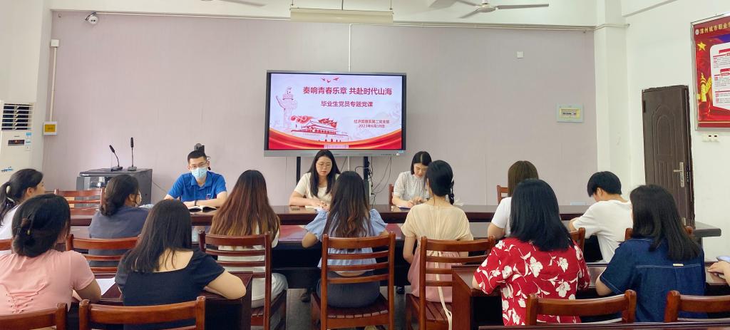 2023年6月18日上午,经济管理系第二党支部在系会议室组织开展“奏响青春乐章 共赴时代山海”毕业生党员离校教育,由支部书记柯桂芳主讲,支部全体毕业生党员参加。